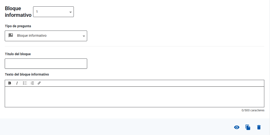 Esta opción te permite destacar información relevante para tus usuarios sobre alguna de las preguntas que desees colocar en tu formulario. El título y el cuerpo de texto que aparecerá en el bloque son editables.