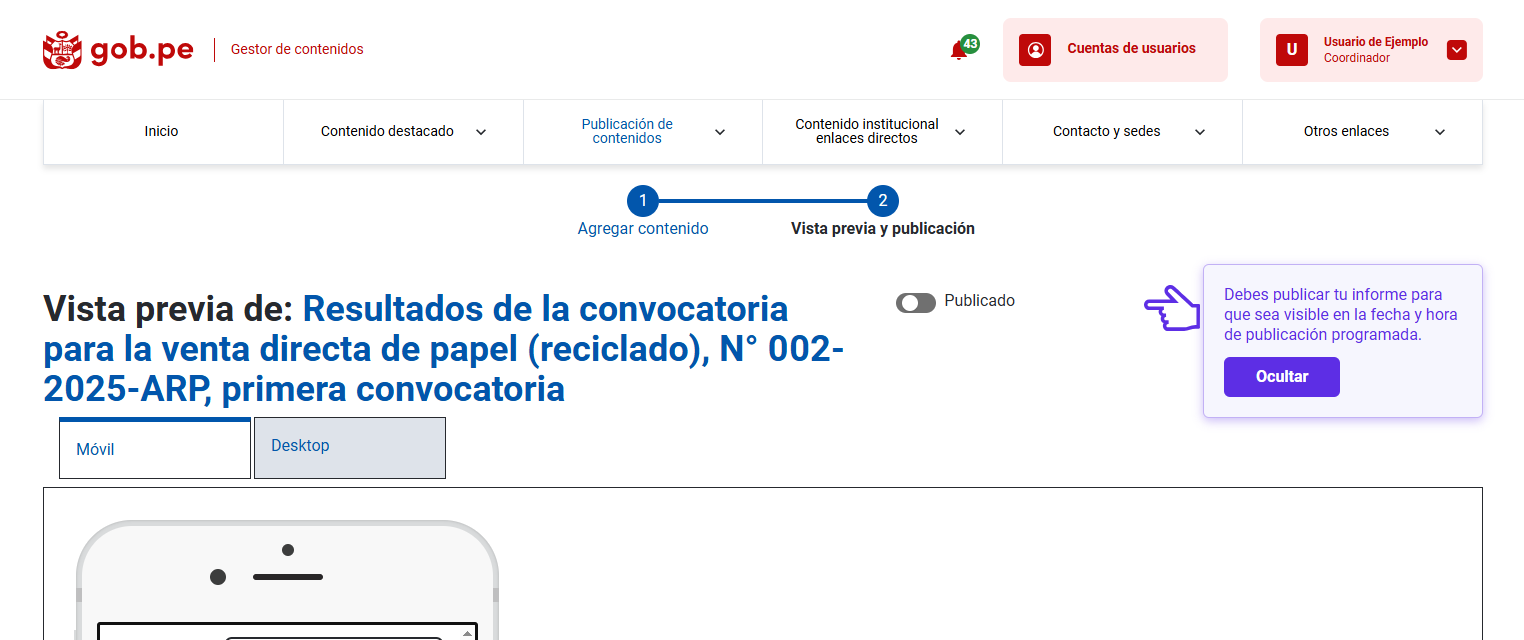 Recuerda que mientras el botón no se muestre de color azul, la información seguirá cargada en el CMS de Gob.pe, pero no será visible para la ciudadanía en la sede digital de tu entidad.