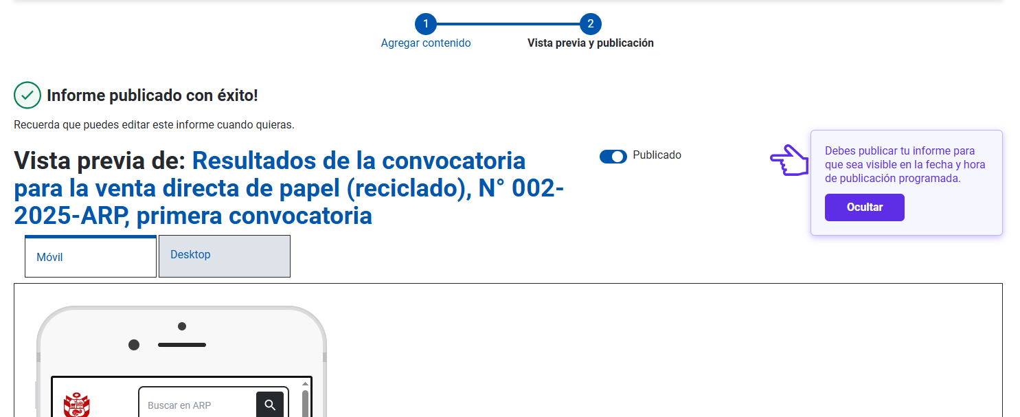 Una vez hayas completado el formulario y le hayas dado clic a “Guardar y continuar”, el gestor de contenidos (CMS) te llevará a una segunda ventana donde podrás revisar el contenido y la apariencia del informe y publicación tanto para celulares como para computadoras (desktop).